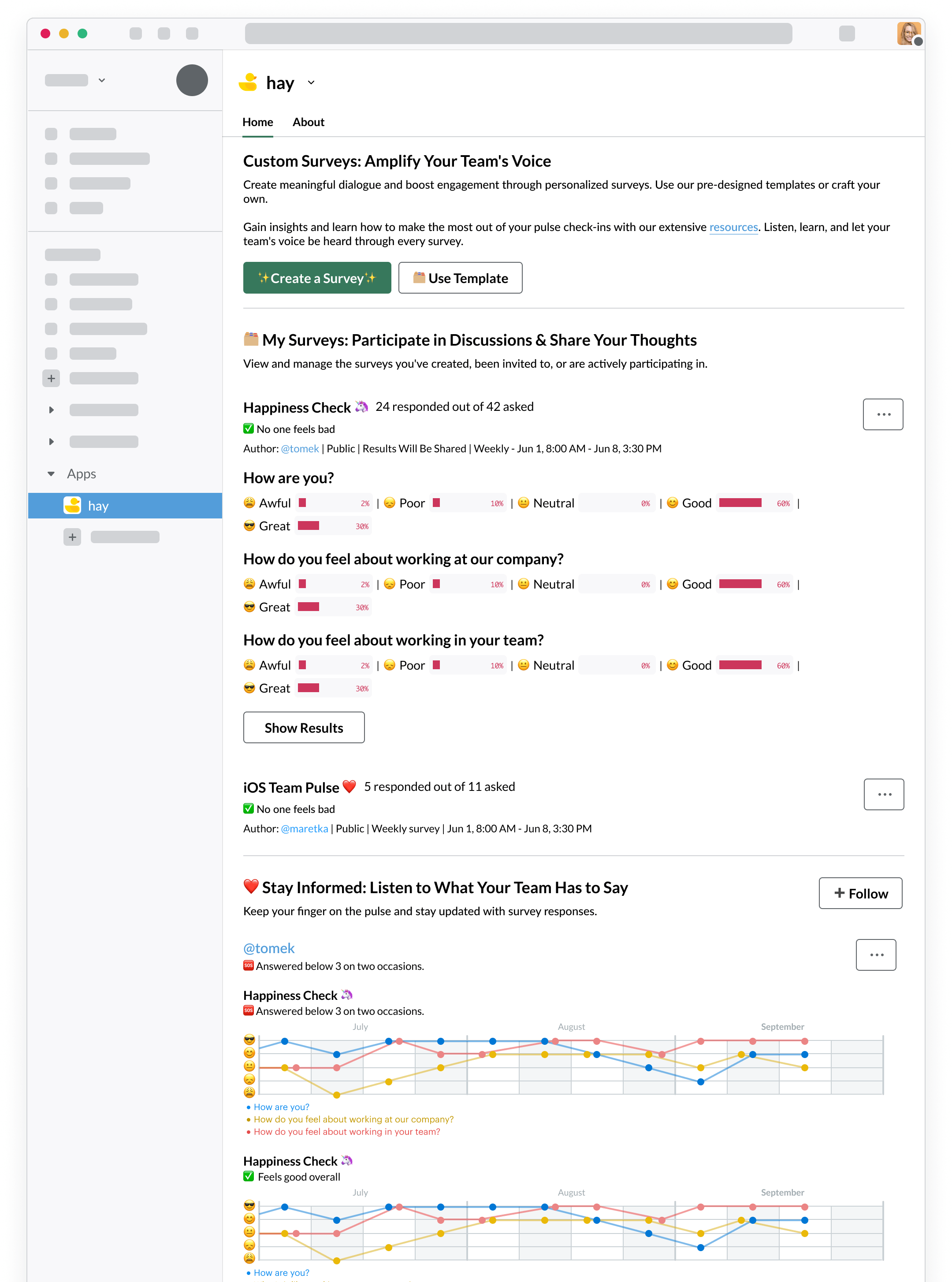 Use our customized templates designed for engineering managers and other departments in tech. Understand your dev team's sentiment, morale, productivity, and satisfaction without breaking a sweat ๐ฆ
